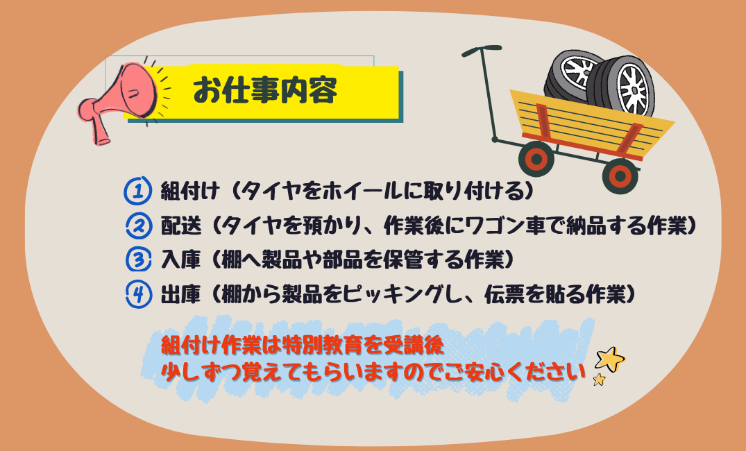 | 仕事内容 | 東京都国立市でのお仕事♪ 倉庫内作業、タイヤの組付け、ルート配送スタッフ大募集◎ 長期安定の大手自動車メーカー関連会社でのお仕事になります。 カンタンな作業で研修も充実していますので、未経験の方でもすぐに覚えられます。 20代、30代、40代、50代、ミドル、エルダーの幅広い年齢層の男性活躍中♪ 【仕事内容】 ①組付け (タイヤをホイールに取り付ける作業) ②配送 (タイヤを預かり、作業後にワゴン車で納品する作業) ③入庫 (棚へ製品や部品を保管する作業) ④出庫 (棚から製品や部品をピッキングしてラベル伝票を貼る作業) \POINT/ ★配送に利用する車は軽ワゴン、または通常のワゴン車等でトラックではありません。 ★タイヤの組付け作業は特別教育を受講後に少しずつ覚えてもらいます。 ★空調(エアコン)完備!夏は涼しく、冬は暖かい環境です♪ ★車のタイヤ、ネジ、ワイパーのゴム、バッテリーなどを取り扱います。 ★冷蔵庫・電子レンジ・給湯器もあるので、お弁当を持参しても心配ありません! 「受動喫煙防止」 喫煙所は完全分煙となります。 |