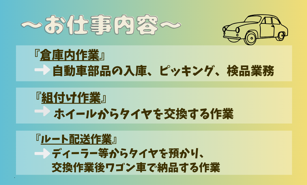 | 職種 | タイヤの組付け・ルート配送 |