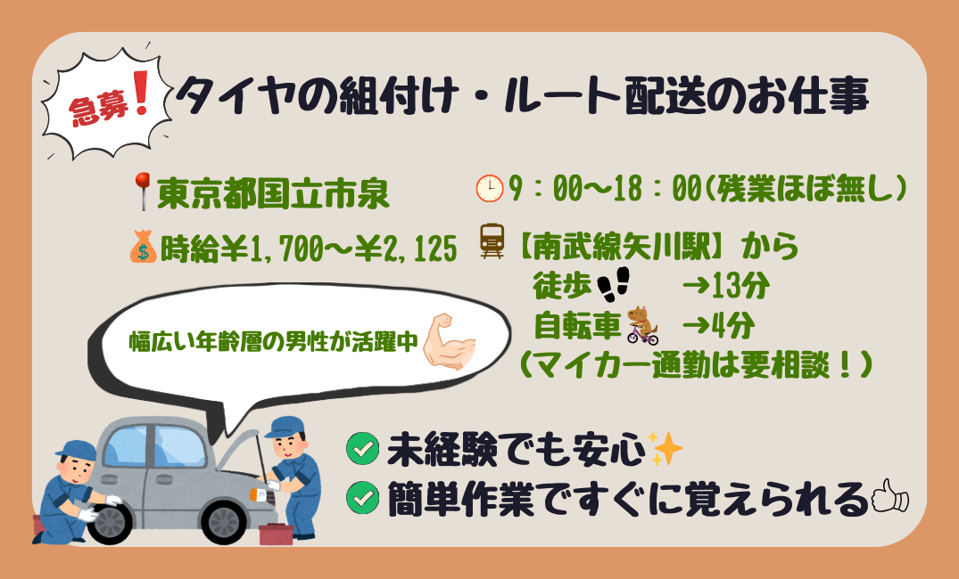 | 仕事内容 | 東京都国立市でのお仕事♪ 倉庫内作業、タイヤの組付け、ルート配送スタッフ大募集◎ 長期安定の大手自動車メーカー関連会社でのお仕事になります。 20代、30代、40代、50代、ミドル、エルダーの幅広い年齢層の男性活躍中♪ 【仕事内容】 ①組付け (タイヤをホイールに取り付ける作業) ②配送 (タイヤを預かり、作業後にワゴン車で納品する作業) ③入庫 (棚へ製品や部品を保管する作業) ④出庫 (棚から製品や部品をピッキングしてラベル伝票を貼る作業) \POINT/ ★配送に利用する車は軽ワゴン、または通常のワゴン車等でトラックではありません。 ★タイヤの組付け作業は特別教育を受講後に少しずつ覚えてもらいます。 ★空調(エアコン)完備!夏は涼しく、冬は暖かい環境です♪ ★車のタイヤ、ネジ、ワイパーのゴム、バッテリーなどを取り扱います。 ★冷蔵庫・電子レンジ・給湯器もあるので、お弁当を持参しても心配ありません! 「受動喫煙防止」 喫煙所は完全分煙となります。 |