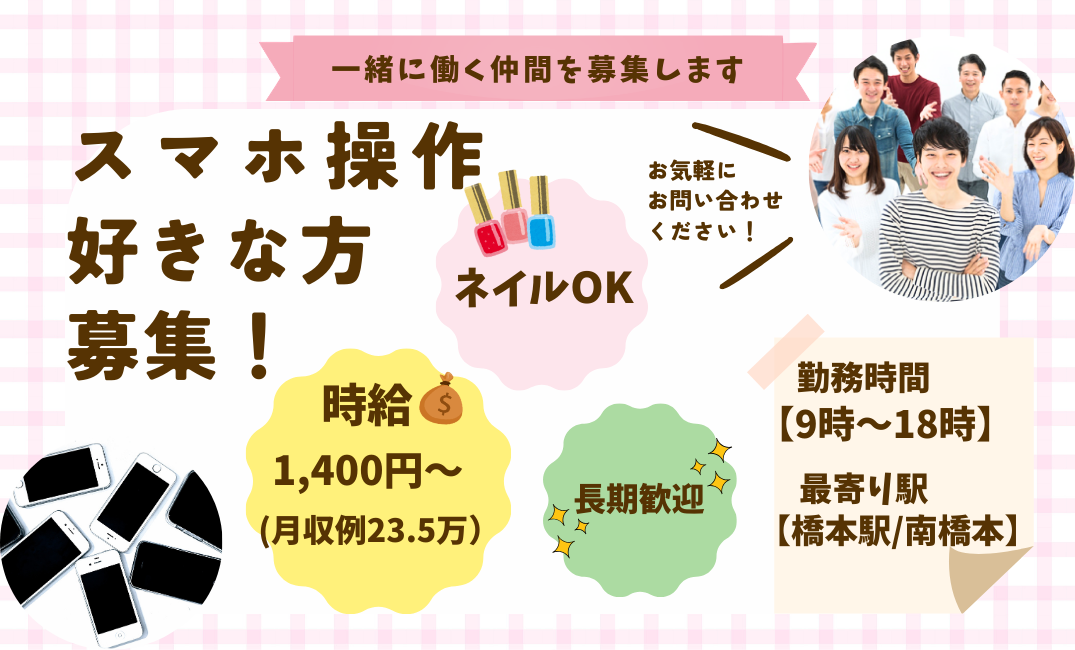 新着[派遣]時給1,400円!携帯電話のキッティング作業!スマホ操作が好きな方、大募集!
