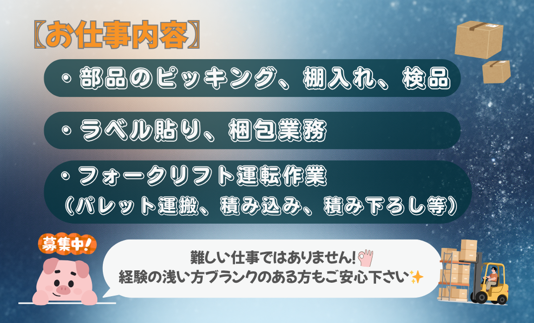 | 職種 | 部品の検品兼フォークリフトオペレーター |