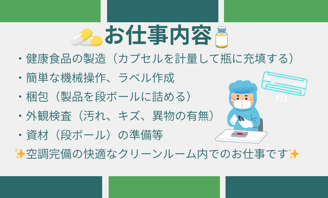 | 仕事内容 | \サプリメントの製造工場にて検査、梱包スタッフ募集☆/ 30代、40代男女活躍中♪ ・健康食品の製造(カプセルを計量して瓶に充填する) ・簡単な機械操作、ラベル作成 ・梱包(製品を段ボールに詰める) ・外観検査(汚れ、キズ、異物の有無) ・資材(段ボール)の準備等 ※空調完備の快適なクリーンルーム内でのお仕事です! ※未経験から勤務している方がほとんどですので、お気軽にご応募下さい♪ ※冷蔵庫・電子レンジ・給湯器もあるので、お弁当を持参しても心配ありません。 ※空調完備(エアコン)で夏も冬も快適屋内勤務! ※弊社、派遣スタッフ多数在籍!!! 「受動喫煙防止」 喫煙所は完全分煙となります。 |