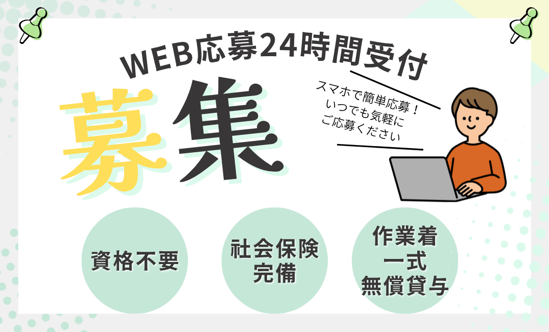 | 応募後の流れ | ▽選考フローについて ・ご応募 ・受付担当者よりご連絡 ・面接(出張面接 or Web面接) ・職場見学 ・内定(おめでとうございます!) <面接は柔軟に対応します!> ※面接には私服や作業着でお越しいただいても構いません。 ※内定までおおよそ2週間程度で完結します。 |