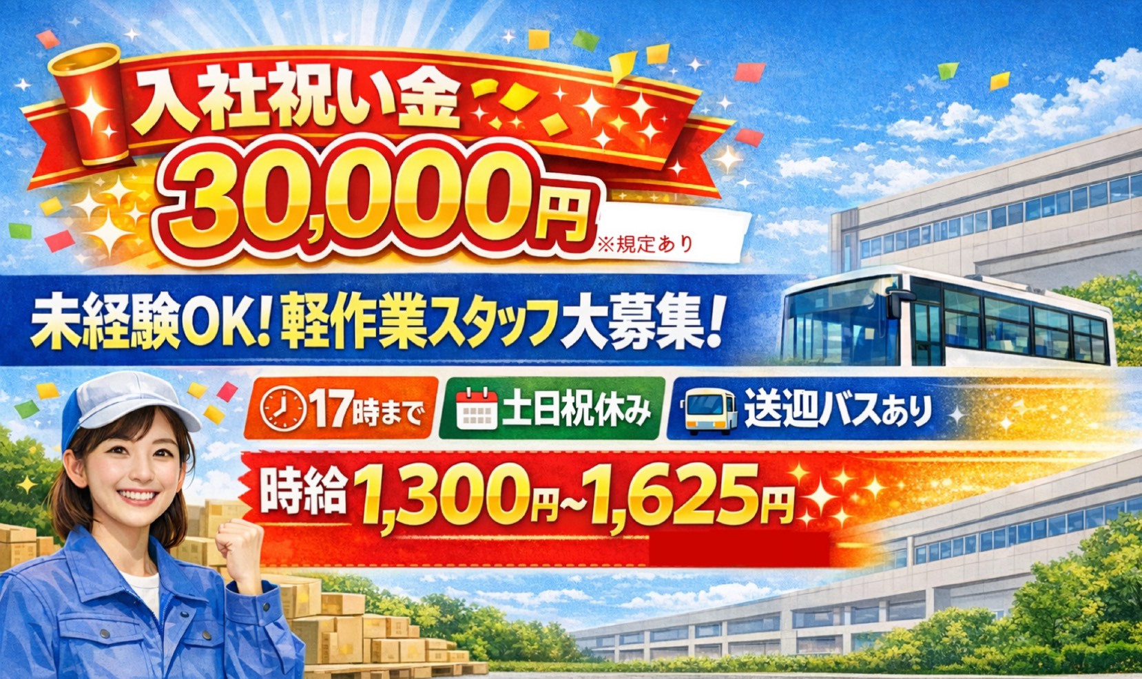 新着[派遣]祝い金3万円◎17時退勤残業なし♪簡単な梱包・軽作業☆家庭都合休みOK・土日祝休み