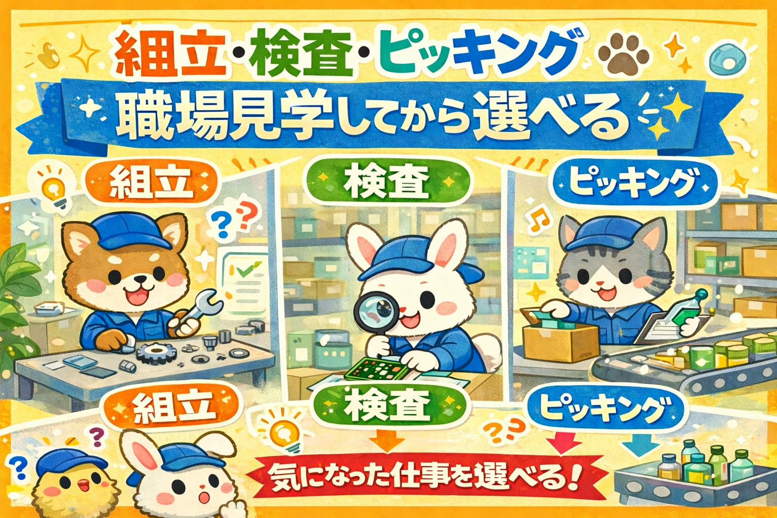 | 対象となる方 | ◎製造のお仕事が未経験でも大丈夫です! ◎モクモク・コツコツ細かい作業が好きな方! ◎サービス業や接客業などの異業種からのチャレンジもお待ちしています! ◎主婦・主夫歓迎!子育て主婦(主夫)さん応援します! ◎長期で働きたい方! ◎U・Iターン歓迎! ◎10代 20代 30代 40代、ミドル、中高年のスタッフが活躍しています! ◎検査、検品、仕分け、調整、梱包、発送、出荷、ピッキング、反復、軽作業務、製造業務が好きな方 ※異業種からの転職、アルバイトパート・短期単発のバイト・アパレル・コンビニ・スーパー・レジ・事務・伝票仕分け・店舗仕分け・内職・居酒屋・旅館・ホテル業務・観光業務・清掃・医療・介護・引越し・物流倉庫・アマゾン仕分けピッキング・イベントスタッフ・サービス業・医療・臨床検査・芸能・ドライバー・バスガイド・フリーランスなど他職種からも転職応援致します!間と一緒に楽しく働いてみませんか!! |