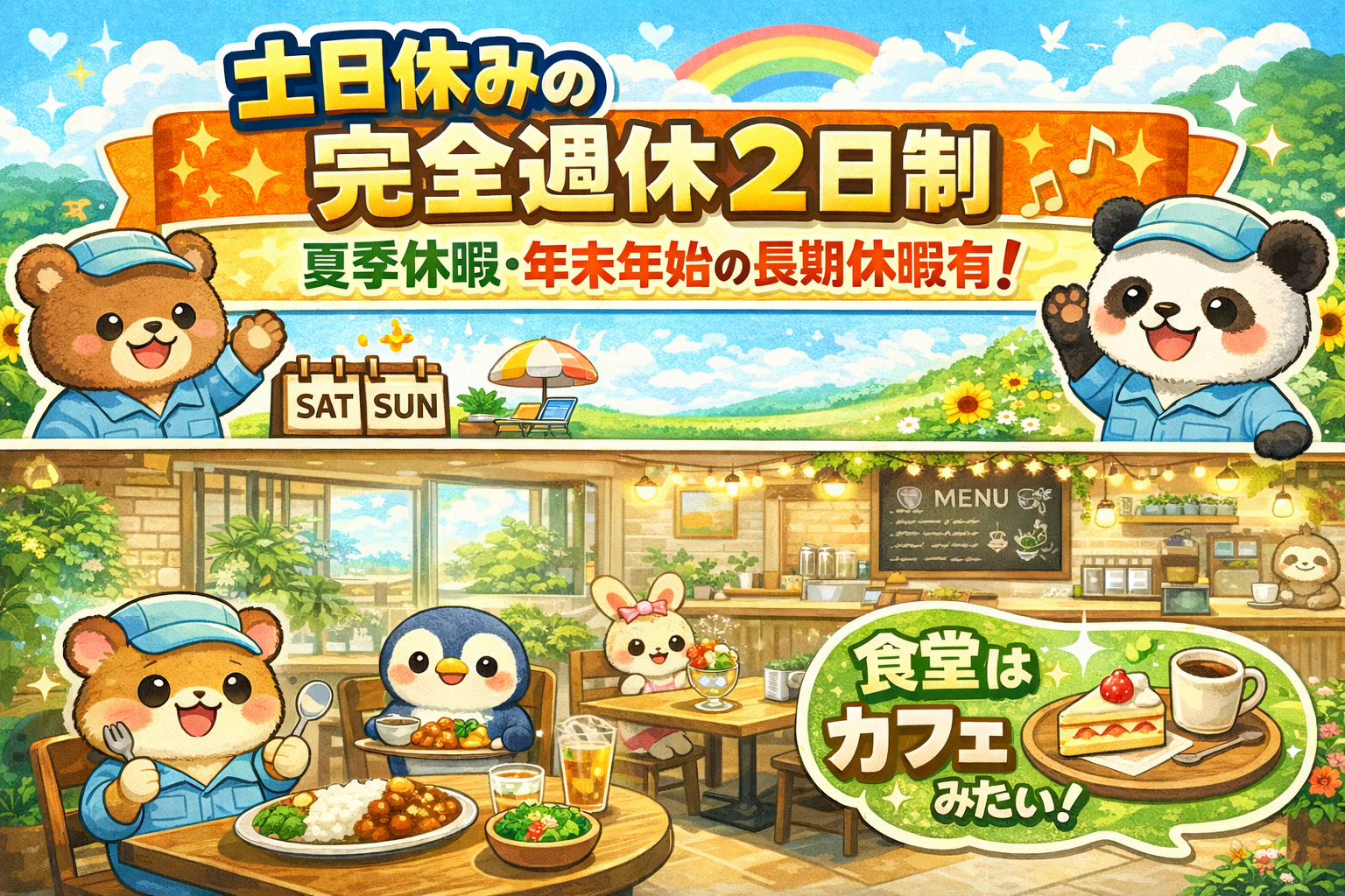 | 休日 | 土日祝日休み GW・夏季休暇・年末年始は長期休暇あり! 年間休日124日以上! 完全週休2日制! その他 慶弔・有給休暇有り♪ |
